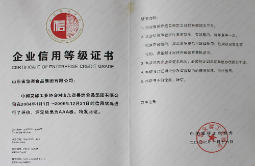 發(fā)酵行業(yè)企業(yè)信用評價(jià)AAA級